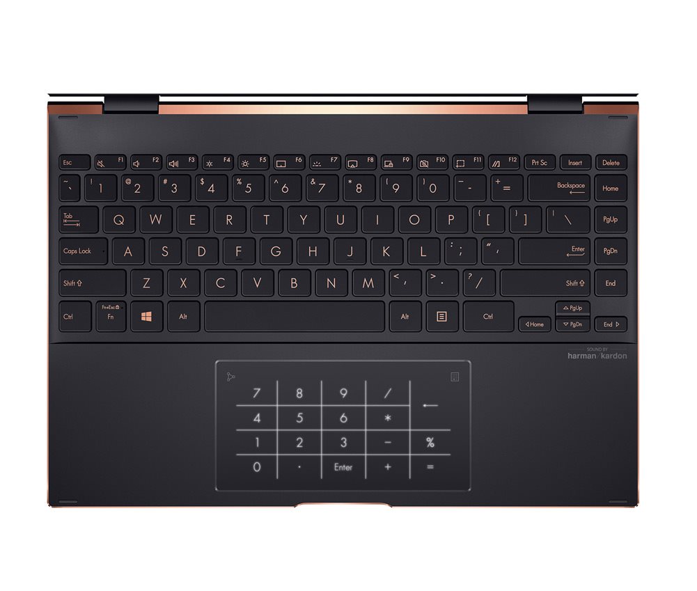 ASUS ZenBook Flip 13 UX371EA sází na exkluzivní design klávesnice od okraje k okraji a navíc zbývá na pravé straně místo pro řadu dalších funkčních kláves, například pro pro sejmutí obrazovky, uzamknutí webové kamery nebo spuštění aplikace MyASUS. ASUS ZenBook Flip 13 UX371AE je k dispozici s inovativním ASUS NumberPadem 2.0, touchpadem s dvojí funkcí a integrovanou numerickou klávesnicí s LED podsvícením. I když je NumberPad aktivován, lze pomocí inteligentního softwaru použít touchpad pro ovládání kurzoru.