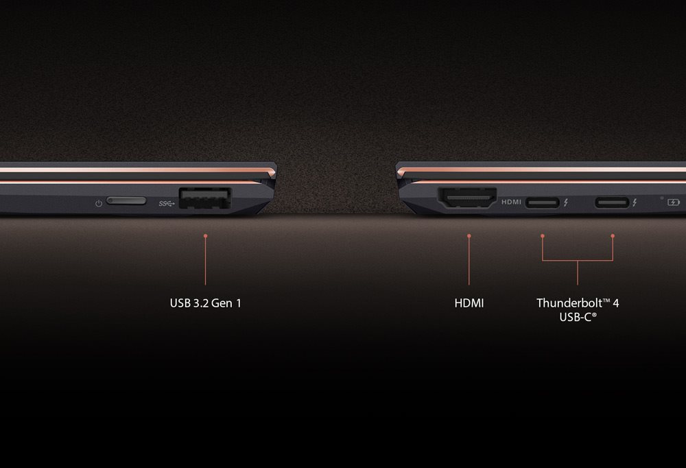 I přes svůj mimořádně tenký design je ZenBook Flip 13 UX371EA vybaven komplexní sadou vysoce výkonných I / O portů. Umístit port HDMI a USB 3.2 Gen 1 do tak tenkého šasi je pozoruhodný technický výkon. Navíc má ZenBook Flip 13 dva porty USB-C s rozhraním Thunderbolt 4 s podporou Power Delivery a DisplayPort pro ultrarychlou a univerzální konektivitu.